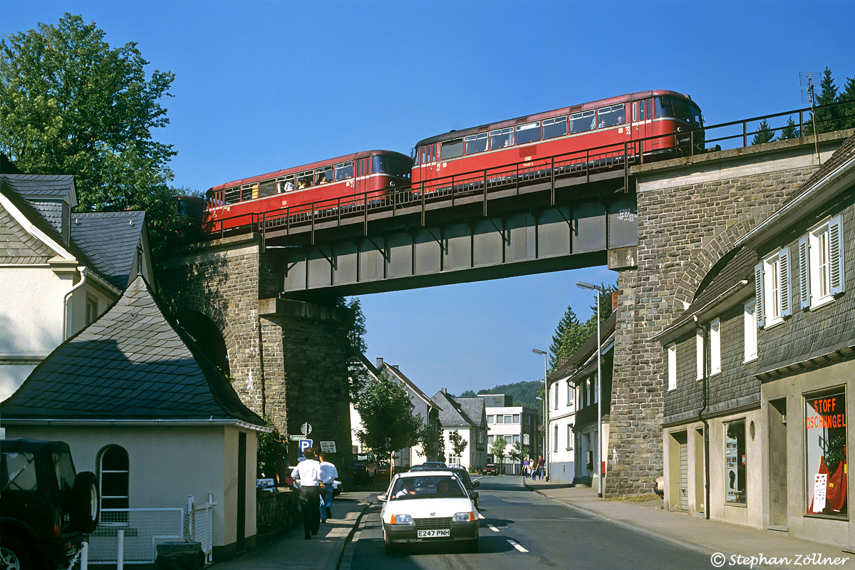 Eine der letzten Möglichkeiten auf dem Drolshagener Stadtviadukt einen Zug abzulichten, bestand am Nachmittag des 21. September 1991 bei einer Sonderfahrt mit Schienenbussen der Eisenbahnfreunde Hönnetal. Bei traumhaftem Herbstwetter rollte der Vierteiler für die Fotografen langsam auf die Brücke, wobei wohl so mancher Meter Filmmaterial belichtet worden ist. Aufnahme von der B 54 ⁄ 55 Hagener Straße aus.