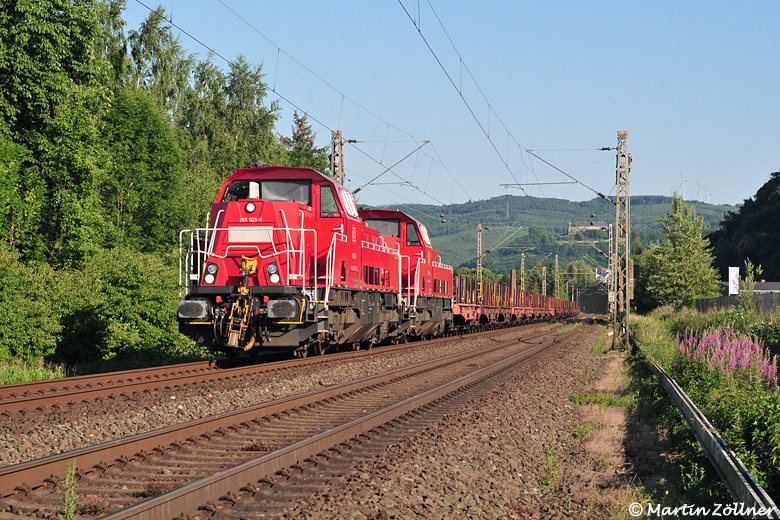 Im Jahr 2024 befördert der Thyssen-Krupp Konzern seine in Hohenlimburg benötigten Brammen aus Duisburg selber. An der Ostausfahrt Hagen Kabel beschleunigen die TKSE Loks 548 und 546 am Nachmittag des 12. Juni den DGS 90552 von der Hütte Krupp-Mannesmann gemeinsam die letzten 7 ½ Kilometer bis zum Ziel.
