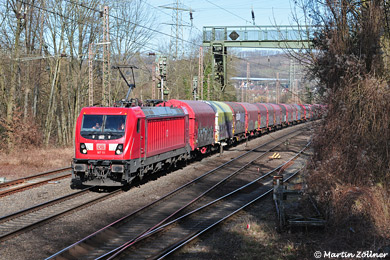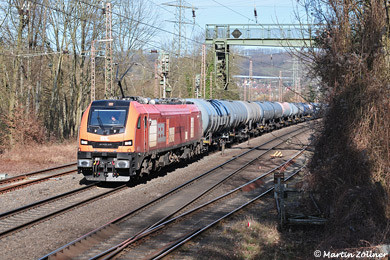 Am 19.02.2025 konnte die in den Einschnitt am Letmather Vorbahnhof fallende Mittagssonne für zwei Güterzugaufnahmen genutzt werden. Während auf dem linken Bild DB Cargo-187 111 mit der Fahrschule den leeren Finnentroper gen Ruhrpott auf Signal HP 1 gen Hohenlimburg bringt ist auf dem rechten Bild zwei Blockabstände dahinter der Lokgigant 2019 312 von BBL mit dem leeren Öler von Linz Vbf auf dem Weg nach Gelsenkirchen-Bismarck zur Wiederbefüllung unterwegs; eine ehemalige Leistung der IGE. Die BR 2019 von Stadler ist auch eine Duallokomotive, deren Leistung im Dieselmodus (2 x 950 kW) aber nicht an die der EuroDual (BR 2159, 2800 kW) heranreicht.
