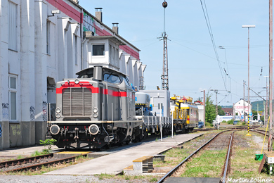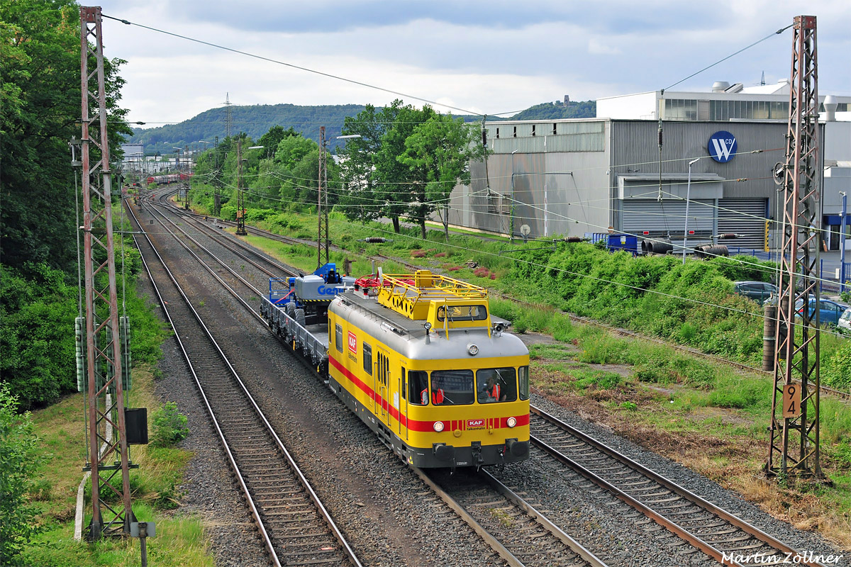 Km 9,4 Hagen Kabel, Fußgängerbrücke BuschmühlenstraßeAm Tag zuvor ließ sich hier auch noch ein in den Landesfarben von Baden-Württemberg lackierter Mops (440 025) auf dem Weg zur Unterflurdrehbank im Dortmunder Betriebsbahnhof blicken (Bild links), sowie der ex-DB 702 115 samt auf einem K-Wagen aufgelasteter Hubbühne vom Typ GENIE S-65 XC auf Heimreise. Der TVT verdient nach erfolgter Hauptuntersuchung bei der VEB in Gerolstein (REV VEB 02.05.2023) nun seine Brötchen bei der Firma Falkenhahn (OLATec-Gruppe) in Kreuztal.
