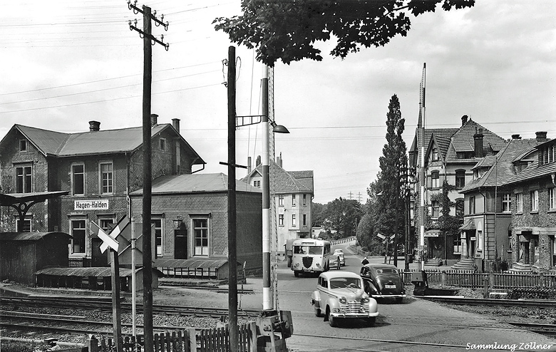 Km 11,403 Bahnhof Hagen HaldenDiese herrliche Alltagsszene wurde im Sommer 1953 am Bahnhof Hagen Halden im Bild festgehalten. Rechts neben dem Stellwerk "Hf" und dem Empfangsgebäude gab es noch den mit Vollschranken gesicherten Bahnübergang Gründelbusch, welcher wohl soeben für den Autoverkehr geöffnet wurde.