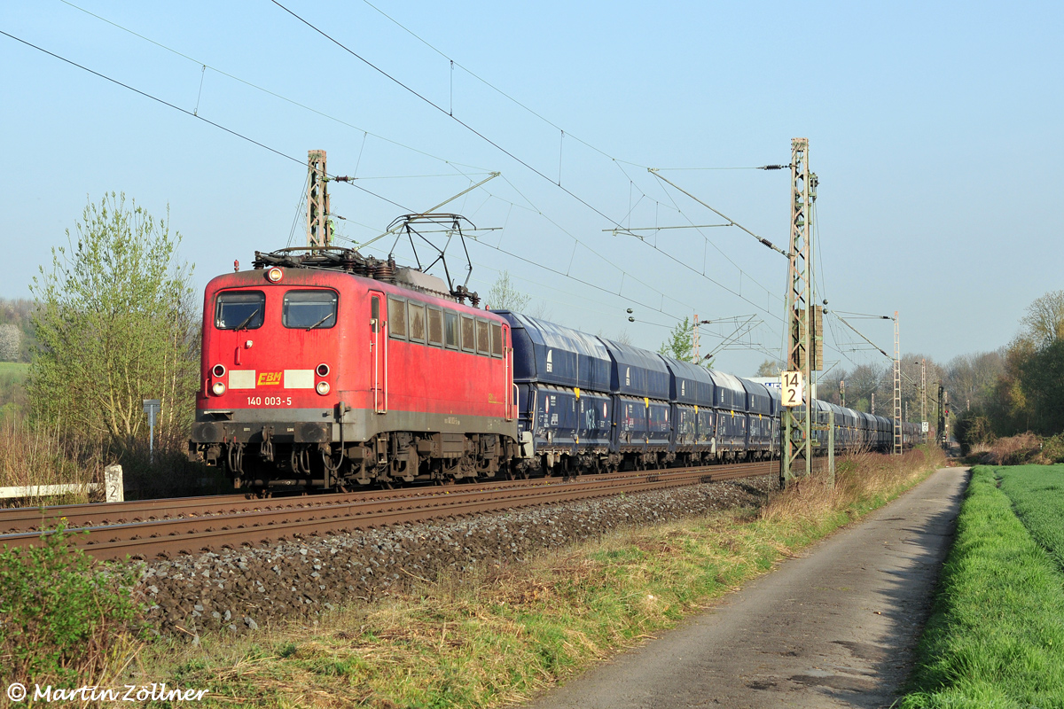 Zwischen dem 01. und 09.04.2014 war bis zum endgültigen Abschalten des Blocks E3 im Kohlekraftwerk Elverlingsen neben den verbliebenen Transporten von Amsterdam nochmals Steinkohle von Bottrop anzuliefern. TX-Logistik beauftragte zur Traktion der sieben Transporte die EBM. Diese setzte ihren E-Lok-Oldtimer 140 003 ein. Am Morgen des 02. April eilt dieser mit den Steinkohlebrocken tatkräftig unterstützt von Dieselschublok 225 094 in Holthausen Richtung Fahrtrichtungswechselbahnhof Werdohl lenneaufwärts am Fotografen vorüber.