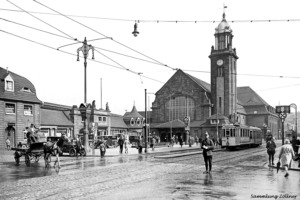 Am 12. Juli 1928 wurde dieses Glasplattennegativ vom Vorplatz des neuen Hagener Hbf angefertigt. Auf dem entsprechenden Abzug gibt es eine Menge zu entdecken. Neben diversen Droschken und dem Fuhrmann mit seinem Pferd sind auch eine Straßenbahn der Linie 6 nach Eilpe Selbeckerstraße sowie der obligatorische Schutzmann auszumachen.