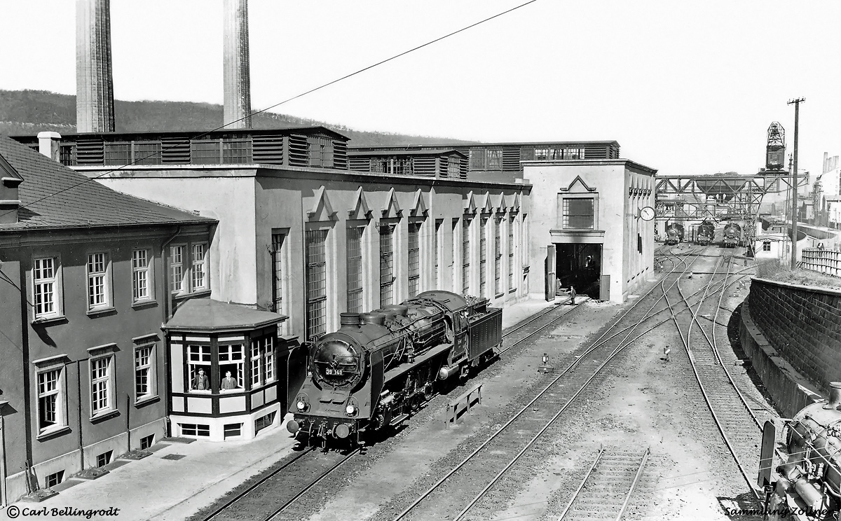 Km 0,4 Bahnhof Hagen Hbf, Stellwerk "Hpf"Das Bw Hagen Eckesey war auch Wende-Bw für die auf der Ruhr-Sieg-Strecke eingesetzten Lokomotiven. Am 20. März 1931 entstand diese Aufnahme von der Brücke Sedanstrasse mit Lok 39 141, welche gerade aus dem heimatlichen Schuppen vor der Lokleitung vorbei in Richtung Hauptbahnhof rollt.