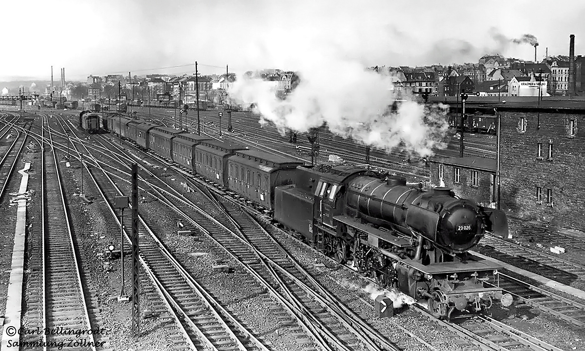 Mit dem von der Wagengarnitur her sehenswerten P 2531 erreicht die Siegener 23 026 am 16. März 1955 den Hagener Hbf. Carl Bellingrodt hatte seine Plattenkamera auf der Eckeseyer Brücke aufgestellt und nahm die Maschine neben dem Stellwerk "Hgw" des Güterbahnhofs bei der Einfahrt auf.