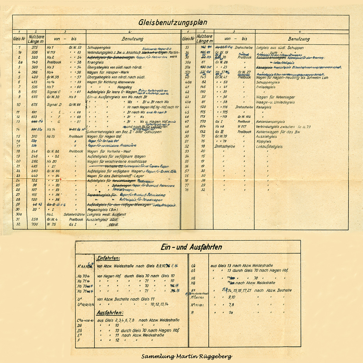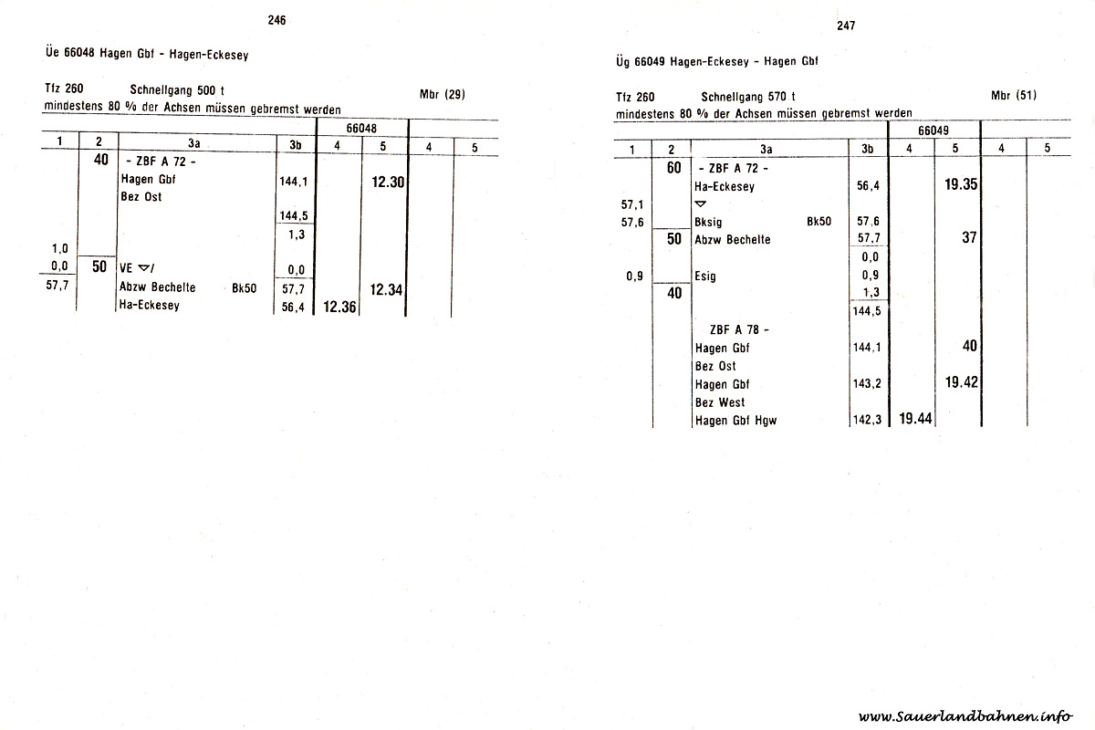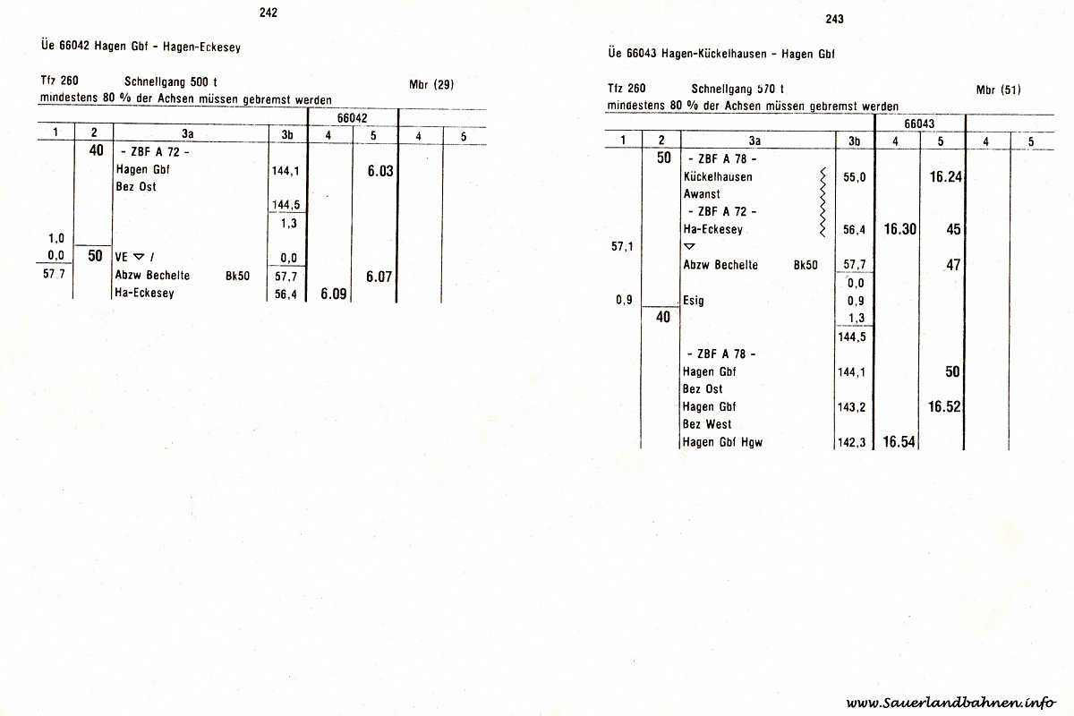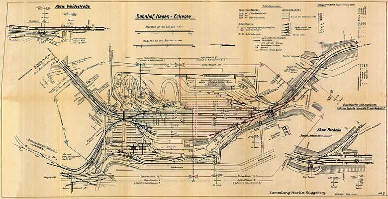Der Bahnhof Hagen Eckesey mit den zugehörigen Abfuhrstrecken, Verbindungskurven und den Abzweigen Weidestraße sowie Bechelte gestaltete sich sehr komplex. Um sich mal ein erschöpfendes Bild aus dessen Glanzzeiten machen zu können, zeigen wir hier den uns freundlicherweise durch Martin Rüggeberg zur Verfügung gestellten Originalgleisplan mit Stand vom 30.12.1947 in hoher Auflösung. Wer sich zusätzlich den genauen Gleisnutzungsplan sowie die zahlreichen, signalgeführten Ein- und Ausfahrtmöglichkeiten anschauen möchte klicke bitte hier.