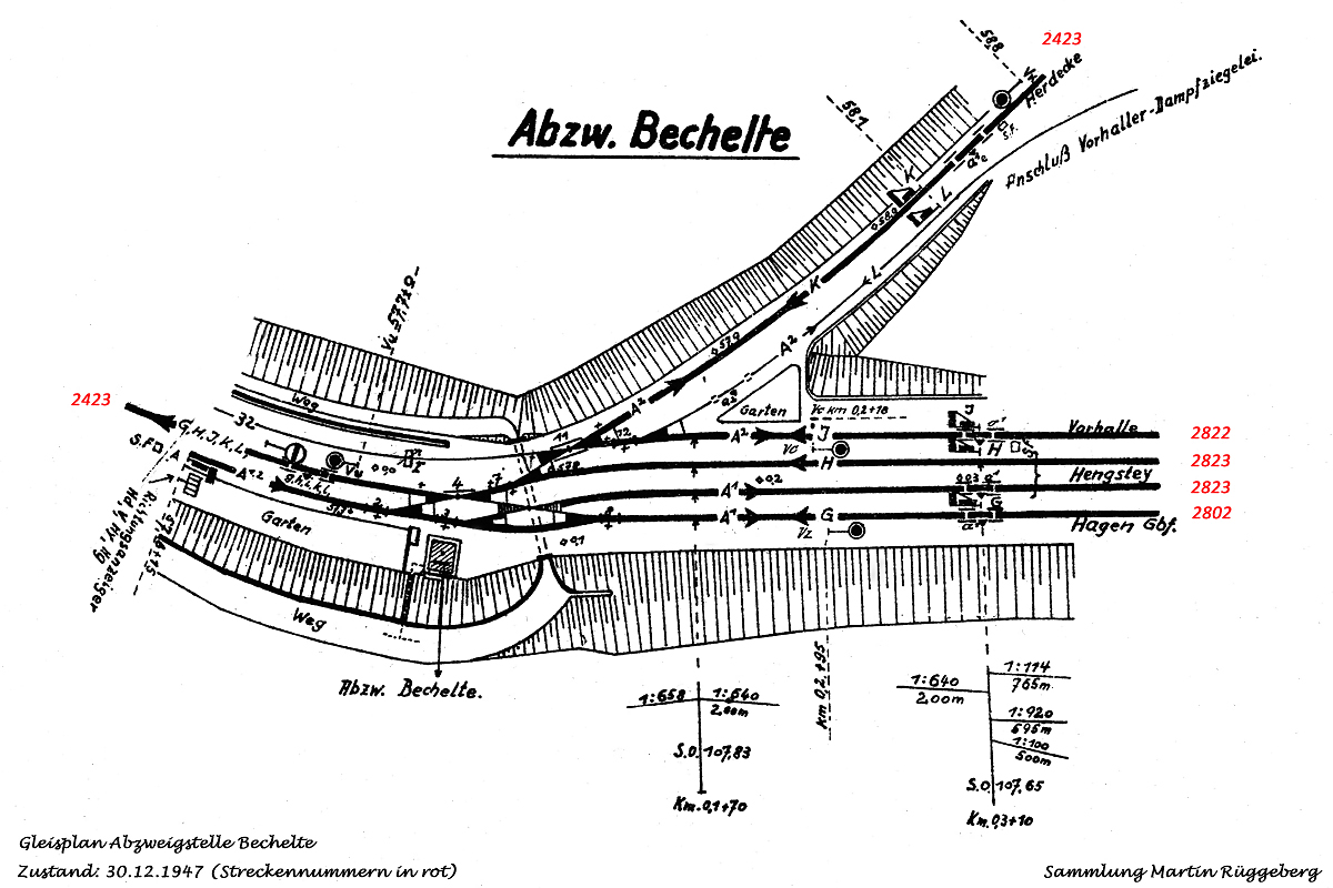 Km 0,0 Abzweigstelle Bechelte [EBEC]Zum besseren Verständnis der ursprünglich an der Abzweigstelle Bechelte vorhandenen Gleisanlagen hier nochmal der Auszug aus dem großen Bahnhofsplan von Hagen-Eckesey mit Stand vom 30.12.1947. Zu diesem Zeitpunkt war die Trasse der Strecke 2423 nach Herdecke wegen der Kriegszerstörung des dortigen Viaduktes bereits gesperrt, die Anlagen aber noch vorhanden. Bemerkenswert auch die Absicherung des Anschlussgleises zur Vorhaller Dampfziegelei mit Hilfe des Hauptsignals "L".