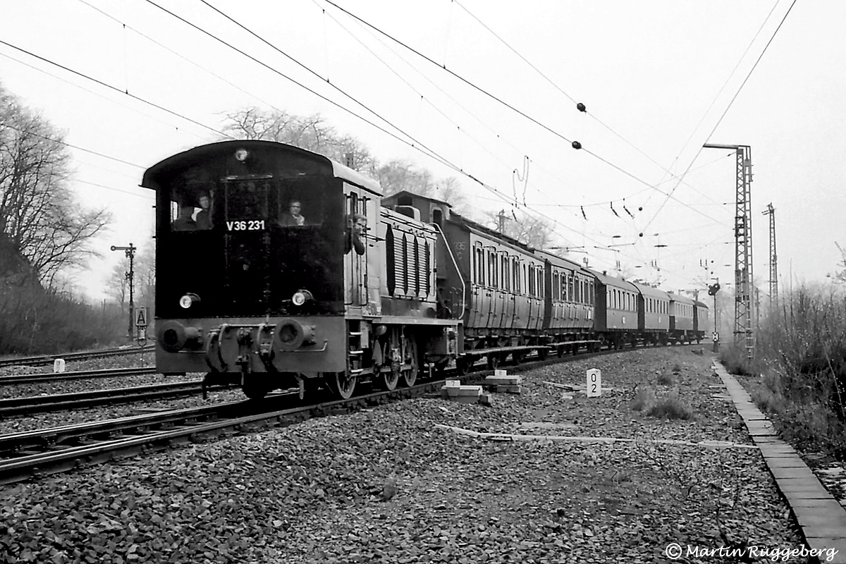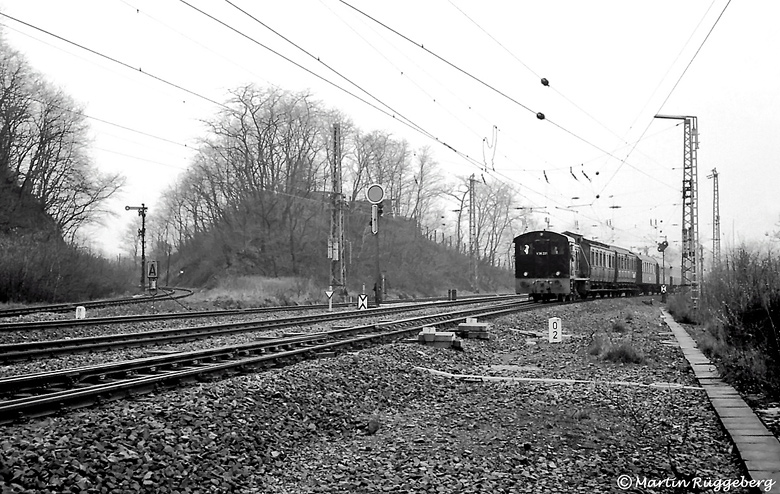 Km 0,2 StreckentrennungEinen guten Überblick bietet diese Aufnahme (vermutlich um 1979) des Bereichs der sich verzweigenden Strecken an der Abzweigstelle Bechelte in Streckenkilometer 0,2. Rechts kommt der DGEG-Museumszug durch die Verbindungskurve vom Hagener Gbf (Strecke 2802), die V 36 befährt gerade die Weiche des Gleises Bechelte – Abzw. Einhaus sowie mittig das Gegengleis von Einhaus nach Eckesey (beides Strecke 2823).