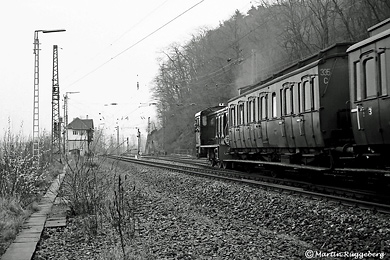 Km -0,553 Bahnhof Hagen-Eckesey [EHGE]Am 26. Oktober 1969 fand bei typischem Sonderfahrtenwetter eine Reise samt der Hohenbudberger 055 567 (G 8.1) "Mit Dampf durch das Bergische Land" von Düsseldorf über Wuppertal, Hagen, Lüdenscheid, Marienheide und Remscheid zum Ausgangspunkt zurück statt. Nach einer Rundfahrt vom Hagener Hbf über den Gbf und Abzw. Bechelte wurde in Eckesey Gleis 12 Wasser genommen sowie die Vorspannlok 57 2070 beigestellt, hier zuerst verkehrt herum vor dem Zug aufgenommen durch Helmut Dahlhaus. Nachdem die 57 gedreht worden war, konnte als Rf durch Gleis 71 wieder über den Hauptbahnhof die Fahrt ins Volmetal fortgesetzt werden.