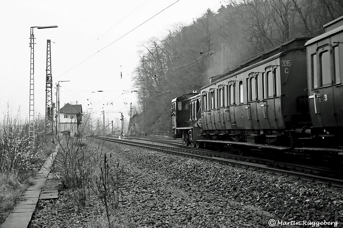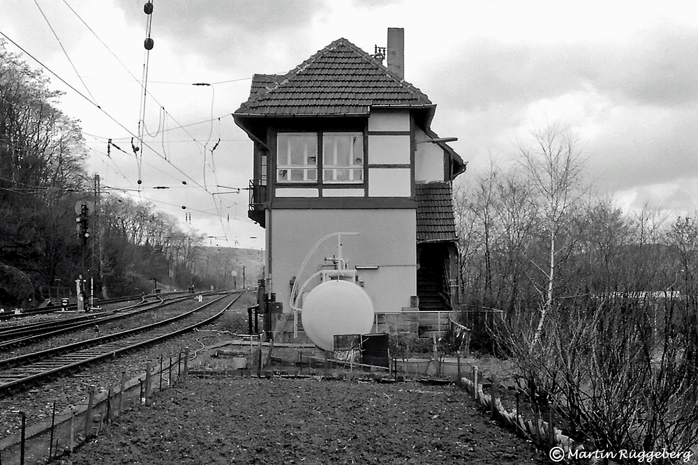 Abzweig Bechelte, die Betriebsstelle mit dem eigenen Gemüsegarten, der sogar im offiziellen Gleisplan verzeichnet ist. Selbstverständlich mit alten Wasch- und Ölfässern zur Wasserversorgung ausgestattet und eingezäunt, damit die hier reichlich vorhandenen wilden Karnickel ja nichts abfressen konnten. Im Winter 1978 ⁄ 79 natürlich komplett abgeerntet, aufgenommen von der Südostseite her.