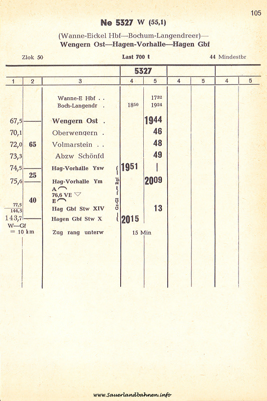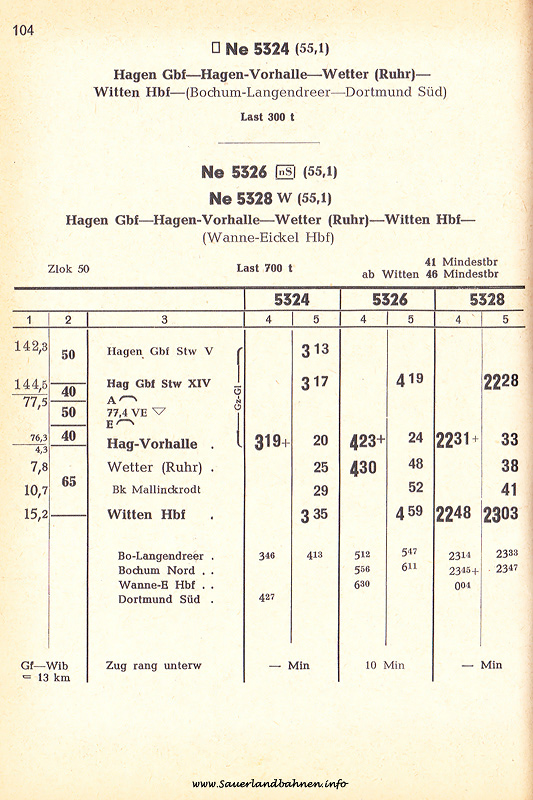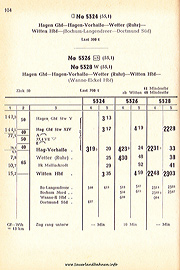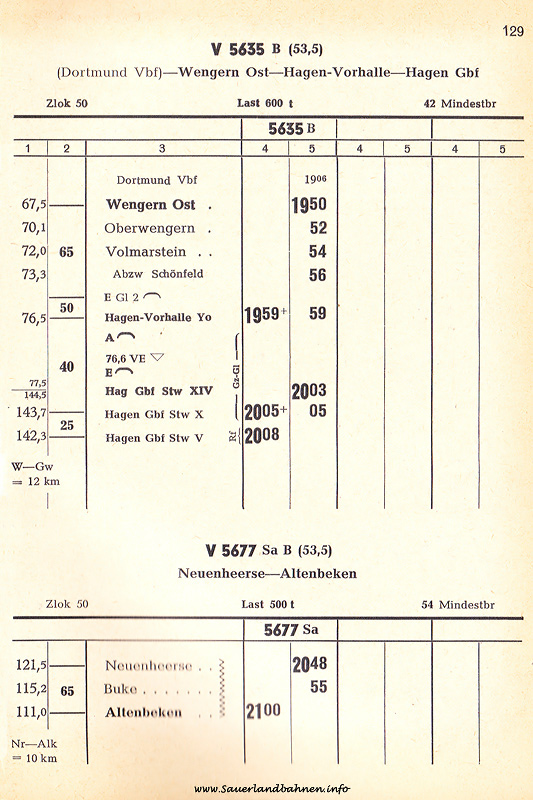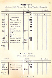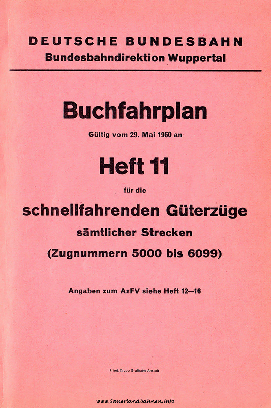 Da die meisten Güterzüge im Raum Hagen Gbf ⁄ Vorhalle auf den Ost-West Achsen verkehrten bzw. verkehren, war es gar nicht so einfach in den historischen Fahrplanunterlagen ein paar die Linie 2803 befahrende Exemplare ausfindig zu machen. Im Heft 11 der BD Wuppertal für den Sommerfahrplan 1960 wurden wir dann fündig, dort sind fünf "Schnellfahrer" verzeichnet, deren Daten wir im Folgenden zeigen:
