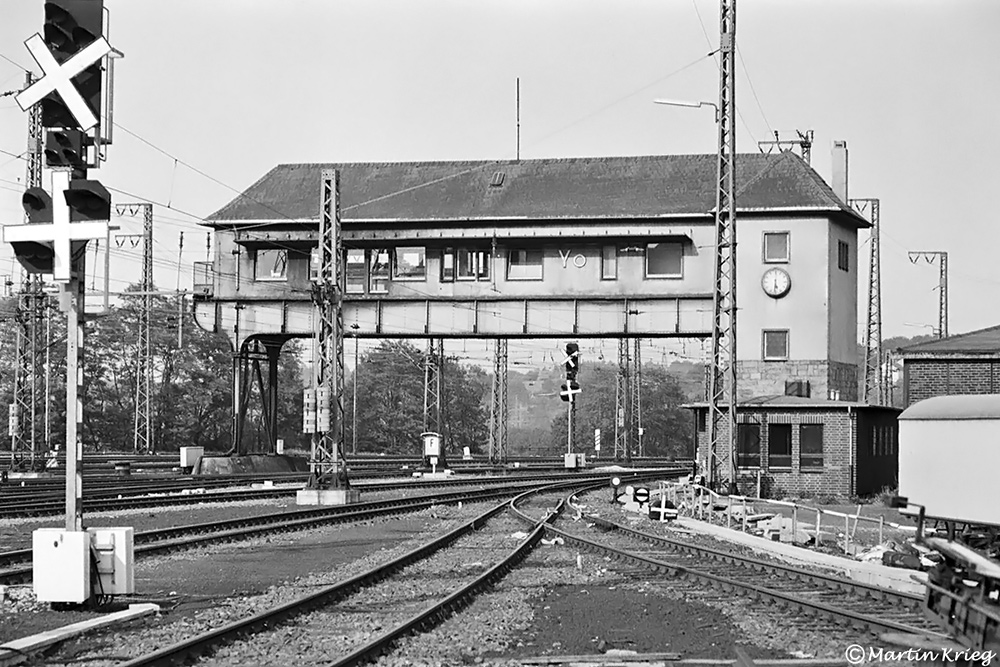 Für den östlichen Bereich des Bahnhofs Hagen Vorhalle war das Reiterstellwerk Yo an der Ausfahrt in Richtung Hengstey ⁄ Gbf ⁄ Hbf und Eckesey zuständig. Martin Krieg nahm es knapp 5 ½ Monate vor seiner Außerbetriebnahme (08.12.1979) mit seiner Kamera auf. Bild vom 31. Mai 1979: