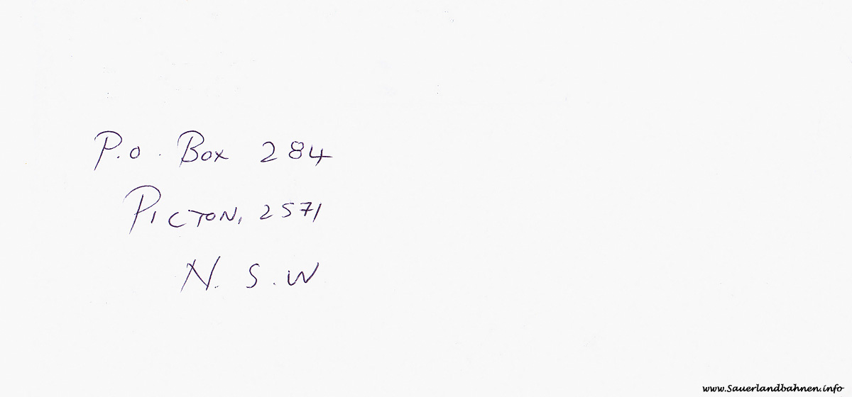 Nach erfolgreichem Zuschlag für 3 Australische Dollar (ca. 1,70 €) trat sie am 16.10. die 16444 Kilometer lange Reise aus Picton, einer Kleinstadt 81 km südwestlich von Sydney in New South Wales, gen Sauerländer Heimat an, wo die Fahrkarte nach 13 Tagen am 29.Oktober unversehrt eintraf und nun hier gezeigt werden kann.