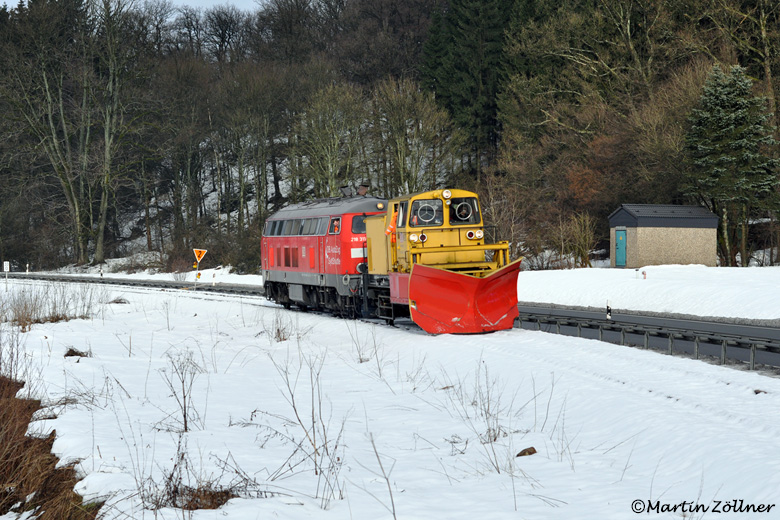 Am 24. Februar 2014 stand nach der Winterpause die Inbetriebnahmefahrt der Gleisschotterabfuhrstrecke Meinerzhagen – Krummenerl auf dem Dienstplan von DB Netz. Da der hierfür benötigte Siegener Schneepflug anderweitig beschäftigt war, half das Bestwiger Gespann aus der Niebüller 218 311 und dem Pflug 947 5 182 aus. Neben der Beseitigung von auf den Gleisen liegendem Windbruchholz und Eiszapfen im Schwarzenbergtunnel wurden auch die Schneereste an den Bahnübergängen entfernt. Bei Kierspe-Sankel war auf der daneben verlaufenden B 54 auch kein störender Verkehr unterwegs.