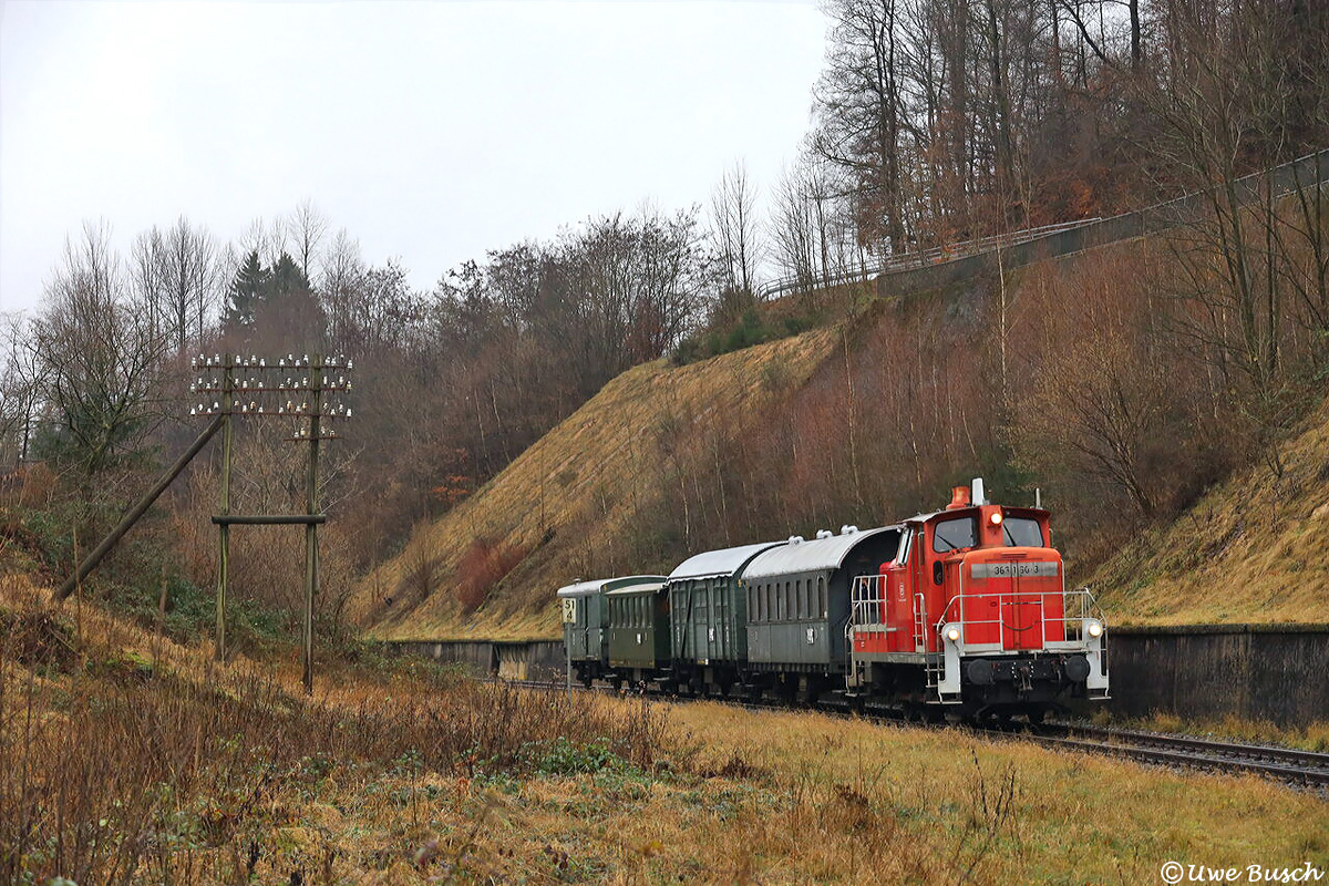 Im Einschnitt bei Kotthausen stehen auch 2025 noch die letzten, vergessenen Doppeltelegrafenmasten an der Strecke 2810. Uwe Busch nutzte die Gelegenheit am 07. Dezember und lichtete einen der beiden Nikolaussonderzüge vom Eisenbahnmuseum Dieringhausen auf der Fahrt nach Meinerzhagen bei gruseligem Wetter dort ab.