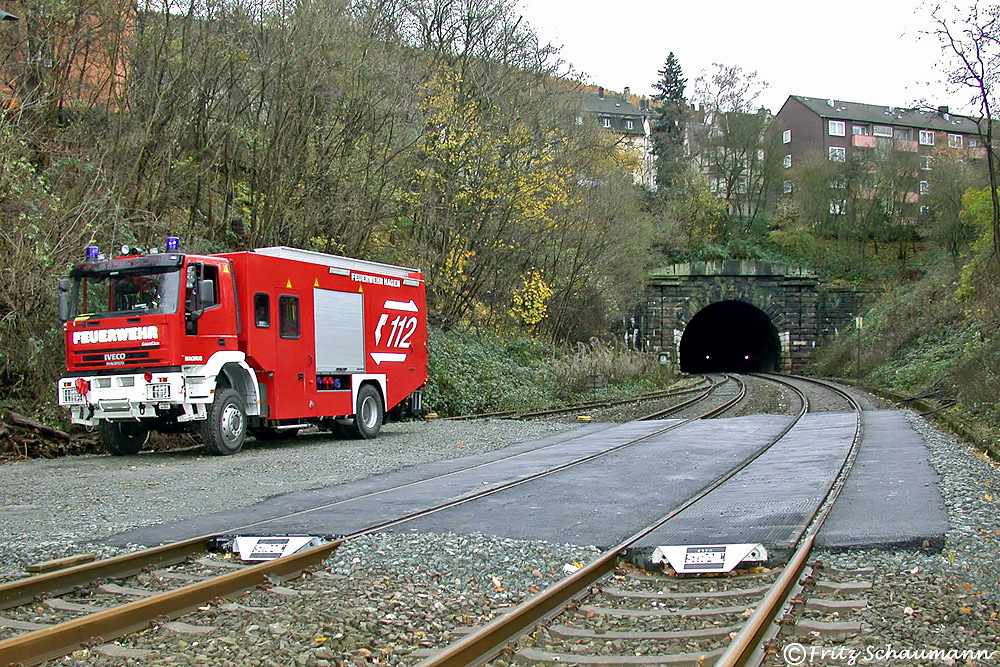 Bei einer Feuerwehrrettungsübung im Hagener Goldbergtunnel am 01. Dezember 2001 kam auch das Zweiwege-Hilfsleistungslöschfahrzeug Iveco 190E 30W der Hagener Feuerwehr zum Einsatz. An der Aufgleisfläche vor dem Goldbergtunnel wartet das Fahrzeug an der ehemaligen Gleistrasse der Linie 2817 auf die Sperrung der Strecke und den Beginn der Übung, als Feuerwehrkamerad Fritz Schaumann auf den Auslöser seiner Kamera drückte. Im Hintergrund ist die damals noch vorhandene Abzweigweiche 304 vor dem Tunnelportal zu erkennen.