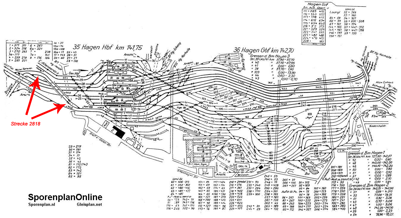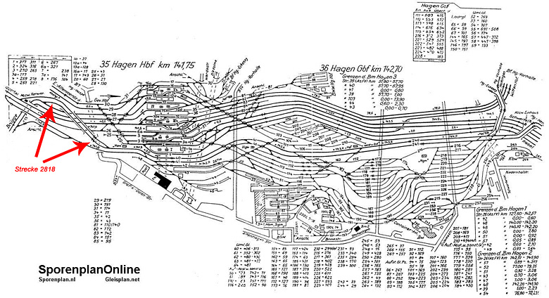 Auf der Webseite www.sporenplan.nl ist ein Gleisplan von Hagen Hbf und Umgebung aus dem Jahr 1955 verfügbar, den wir hier mit freundlicher Genehmigung zeigen dürfen. Die Strecke 2818 ist dabei mit Pfeilen gekennzeichnet:
