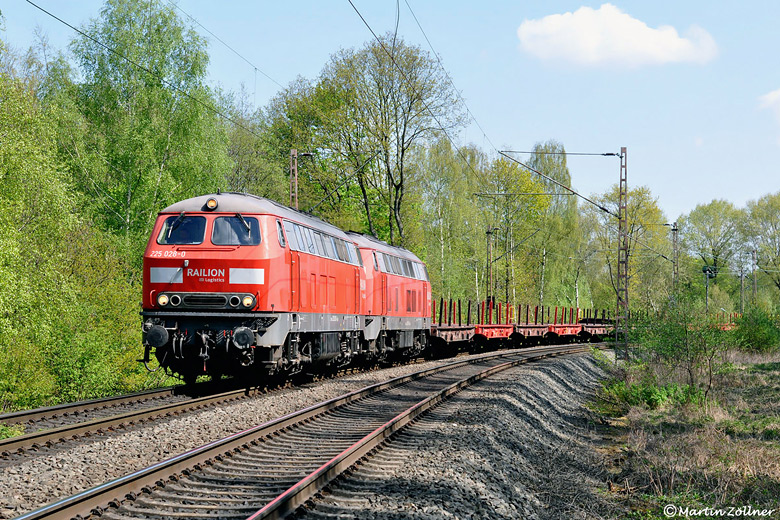 Die letzte planmäßige V 160-Doppeltraktion in NRW wurde im Jahr 2011 vor dem Brammenpendelzug Duisburg Hütte KM -- Hohenlimburg Hoesch erbracht. Auch hier war noch im gleichen Jahr die Ablösung durch die neu in Oberhausen stationierten 247ger (Class 66) geplant. Mit dem Leerpark aus Hohenlimburg rollen 225 028 und 021 am 15. April am Abzweig Hengstey in Richtung Ruhrpott.