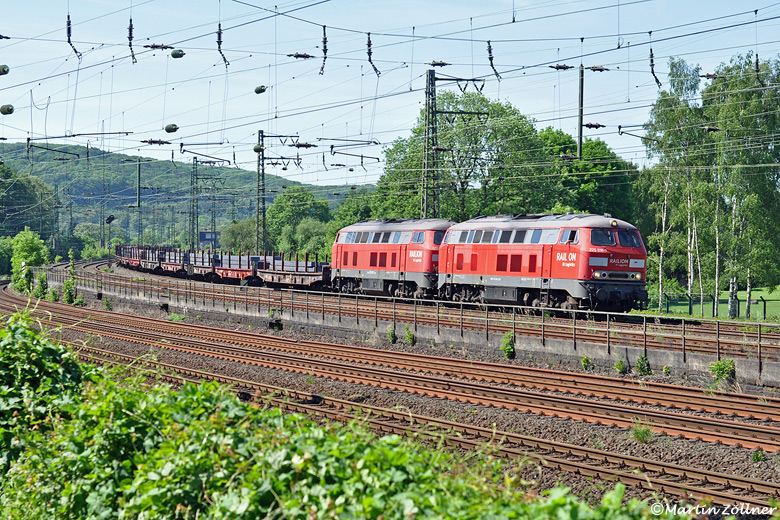 Knapp ein Jahr vor der Ablösung der letzten planmäßigen V 160-Doppeltraktion in NRW rollte der Brammenpendelzug Duisburg Hütte KM -- Hohenlimburg Hoesch am 26. Mai 2012 von Vorhalle kommend am Wasserwerk Hengstey die dortige Rampe herunter. 225 018 und 020 stellen die Traktion sicher.