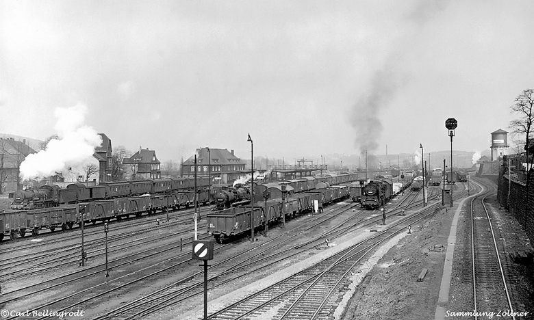 In Hagen Vorhalle, verbotswidrig auf der östlichen Seite der Rheinischen Eisenbahnbrücke stehend, konnte man das Geschehen im Rangierbahnhof gut verfolgen. In den fünfziger und bis Mitte der sechziger Jahre natürlich uneingeschränkt mit Dampfbetrieb, wie auf diesem Bild vom 23. April 1956 mit alleine drei Maschinen in Richtung Vorbahnhof fotografiert. Ganz links verlässt der P 3562 mit einer Eckeseyer P 8 den Bahnsteig in Richtung Witten, während zwei Lokomotiven der BR 50 mit ihren Güterzügen auf Ausfahrt warten.