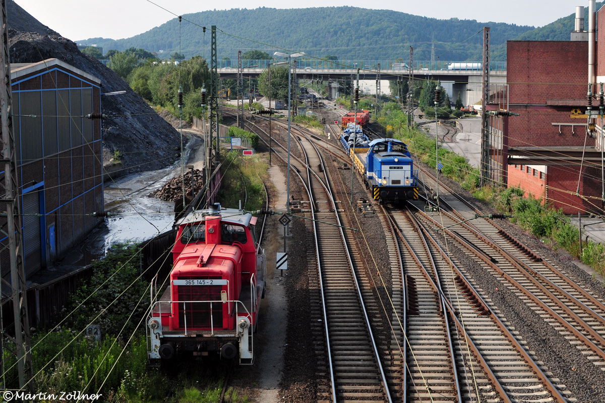 Im Zuge der Erneuerung der VzG-Strecke 2800 Hagen Hbf – Hagen-Kabel mitsamt Umleitung der Personenzüge über die G-Bahn 2820 sind am 22. August 2013 in Kabel auch zwei Lokomotiven der V 60-Bauart im Einsatz. Während links 365 145 von BDK den Bauarttyp West repräsentiert, kommt rechts mit der V 60 SP 015 von Spitzke eine Ost-V 60 mit einem Bauzug aus der Baustelle in den Bahnhof gerollt.