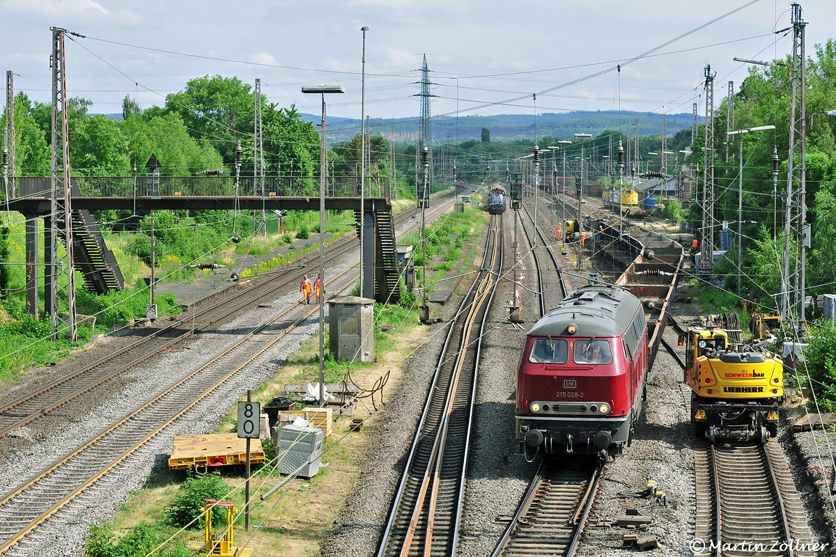 Im Juni 2023 fanden im Bereich Hagen Kabel umfangreiche Gleiserneuerungsarbeiten statt. Am 19. Juni konnte von den fünf hier eingesetzten Bauloks mit der EfW 215 028 die wohl interessanteste Maschine von der Brücke Schwerter Straße aus mit einem Altschottertransport beim Rangieren bildlich verhaftet werden. Bis 2012 kam die Maschine mit dem "Hohenlimburger" öfters hier durch. Im Zuge dieser Baumaßnahmen wurde auch die links stehende, seit 29 Jahren ungenutzte Fußgängerbrücke zum ehemaligen Inselbahnsteig entfernt, sodass dieses Bild eines der letzten mit deren Existenz darstellt.