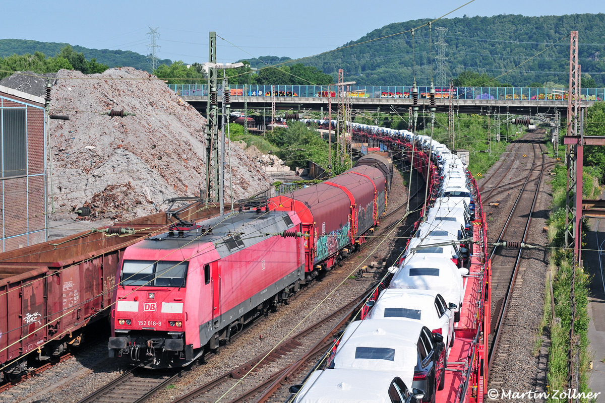 Km 82,3 Bahnhof Hagen-Kabel, Nordeinfahrt [EHGK]Für einen Werktagvormittag schon ungewöhnlicher Hochbetrieb an der Kabeler Nordeinfahrt: Links rollt 152 018 mit ihrem Mischzug nach Kreuztal von Vorhalle kommend in den Bahnhof während daneben ein ebenfalls mit 152 bespannter Audizug von der Ruhr-Sieg-Strecke über das Westgleis der Strecke 2844 Richtung Westhofen ⁄ Osnabrück abbiegt. Im Hintergrund wartet derweil ein wegen belegter G-Gleise ab Hagen Hbf über die P-Bahn geleiteter Kesselwagenzug Richtung Süddeutschland mit RPool-186 auf Einfahrt bzw. auf Blockabstand zu 152 018.