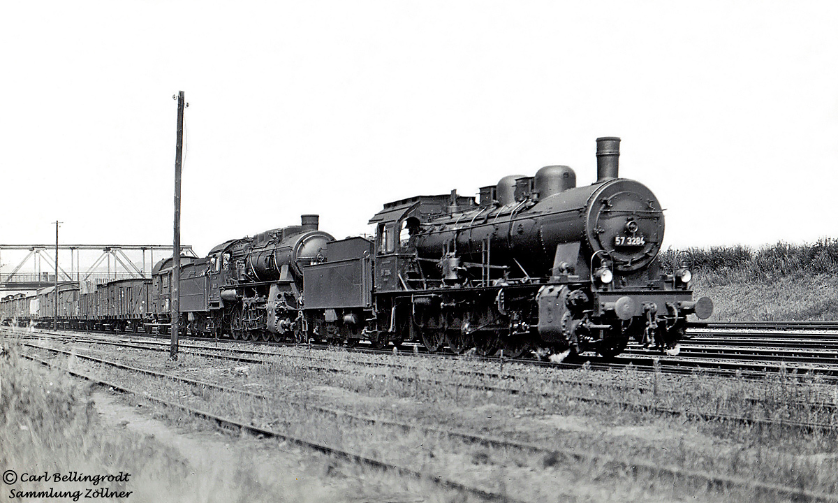 Als Carl Bellingrodt am 08. August 1935 bei Hagen Boele diesen gemischten Güterzug mit den Zugloks 57 3284 (Bw Hagen-Vorhalle) und 58 1721 (Bw Altenhundem) in Richtung Vorhalle fahrend aufnahm, war von der später an dieser Stelle querenden Autobahnbrücke der BAB 1 noch nichts zu sehen.