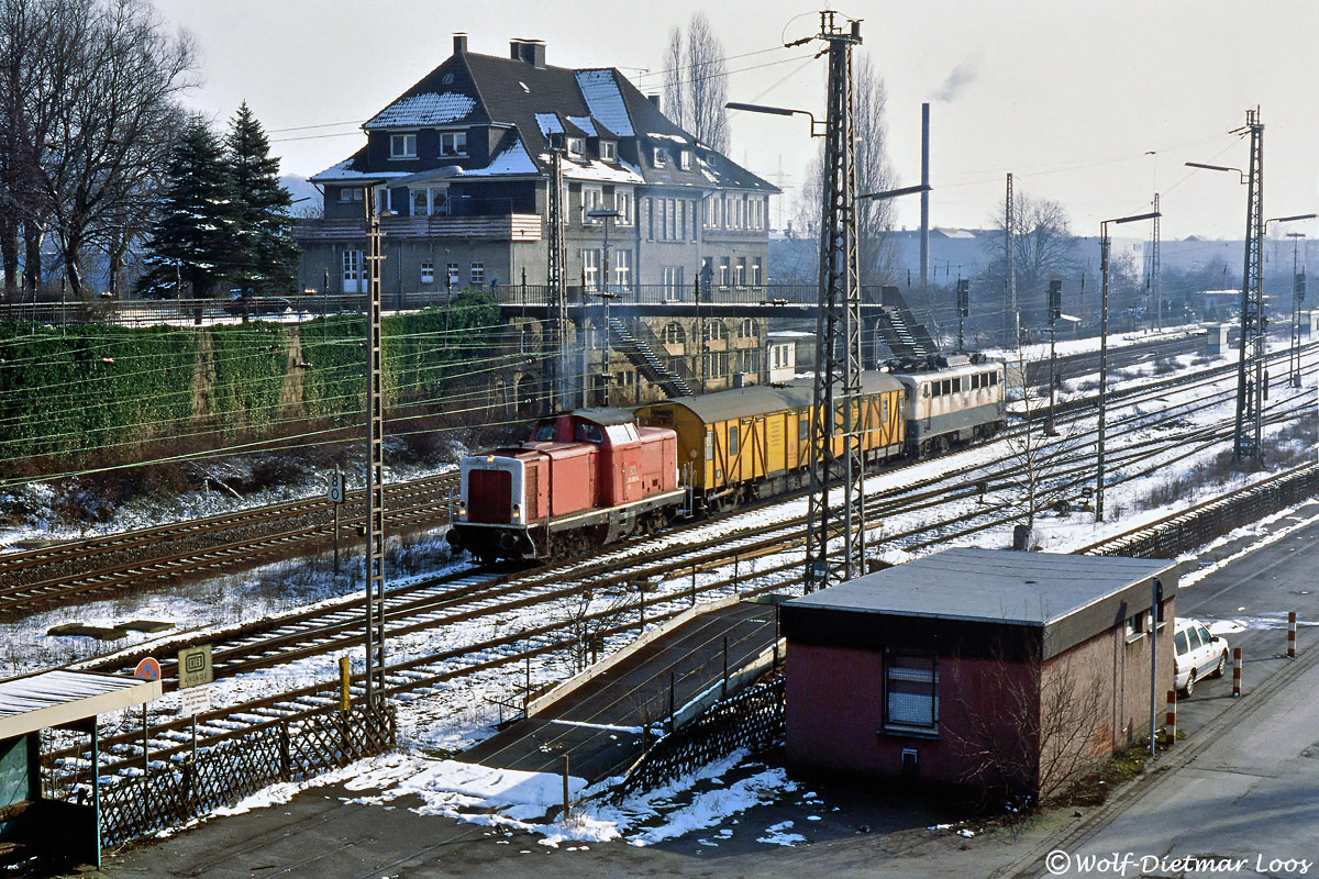 Km 82,455 Bahnhof Hagen-Kabel [EHGK]Wenige Tage nach dieser Aufnahme wurde die Hagener 212 007 auf Initiative einiger Eisenbahner für Filmaufnahmen im Bw Eckesey in altrot zurücklackiert. Am 13. Februar 1999 konnte Wolf-Dietmar Loos sie noch in orientrot mit dem Gerätewagen und einer defekten 140 im Schlepp vor dem Empfangsgebäude in Hagen Kabel bei der Ausfahrt in Richtung Heimatdienststelle aufnehmen. Im Vordergrund sind dabei noch die Anlagen der ehemaligen Autozugverladung zu sehen.