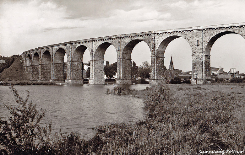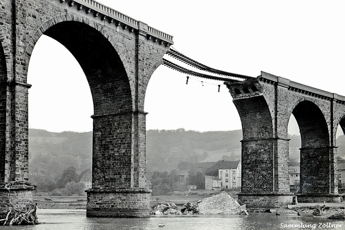 Die Reparatur des nun fehlenden Teils der Brücke begann umgehend. Zwei Jahre später, am 12. April 1945 sprengte die zurückweichende, deutsche Wehrmacht den verstärkten Brückenpfeiler 4 samt den angrenzenden Bögen aus dem Viadukt heraus. Erst 1952 war die Reparatur der Brücke beendet und im Sommer 1957 verkehrten wieder Züge.
