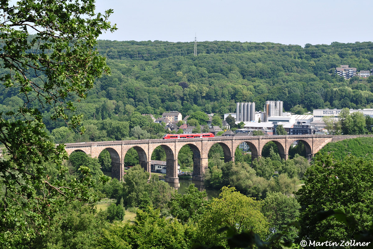 Km 2,0 - 2,3 Ruhrviadukt HerdeckeAm 13. Juni 2025 wagte der Fotograf auch einmal den Aufstieg zum Rundwanderweg um den Hagener Kaisberg. Vom Aussichtpunkt auf den Ruhrviadukt aus fertigte er dann diese Aufnahme von 632 109 an, der als RB 14662 auf dem Weg von Dortmund nach Lüdenscheid das imposante Bauwerk überquert.
