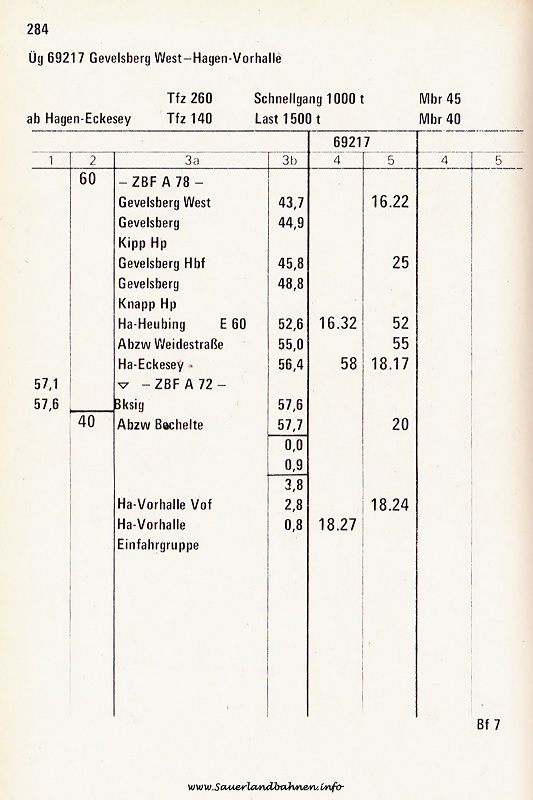 Nach längerer Suche ließen sich dann doch noch einige Übergabegüterzüge im Buchfahrplanheft 272 der BD Essen für den Winterfahrplan 1982 ⁄ 83 finden, die die Strecke planmäßig befuhren. Erkennbar ist das aber nur aufgrund der Kilometrierung (km 3,7 bis km 0,8) im Bereich Vorhalle Vof bis Einfahrgruppe, da nur diese Linie einstellige Werte aufweist.