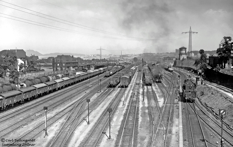 Auf der östlichen Seite der Rheinischen Eisenbahnbrücke stand Carl Bellingrodt unter anderem auch am 12. August 1959 und beobachtete das Geschehen im Vorbahnhof mit der Kamera. Rechts rangiert die Vorhaller 50 207 durchs Bild. Dieser Gleisbereich wurde später komplett umgestaltet und anders trassiert.