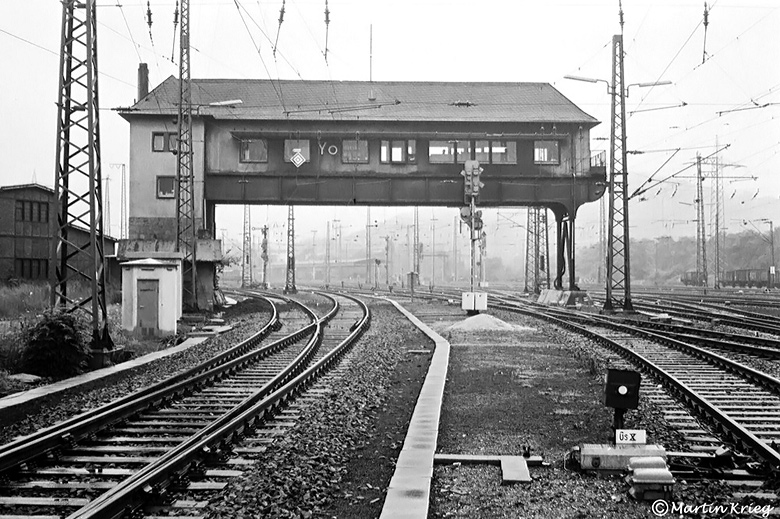 Km 3,8 Bahnhof Hagen-Vorhalle, Stellwerk Yo [EHGVO]Am Ende der Linie 2825 in Kilometer 3,8 stand das Reiterstellwerk Yo, zuständig für den östlichen Bereich des Bahnhofs Vorhalle. Es wurde am 08. Dezember 1979 außer Betrieb genommen, seine Aufgaben übernahm das neue SpDrS 60⁄600 Stellwerk Vof. Martin Krieg nahm den Veteranen am 17.07.1979 kurz vor seinem Ende auf.