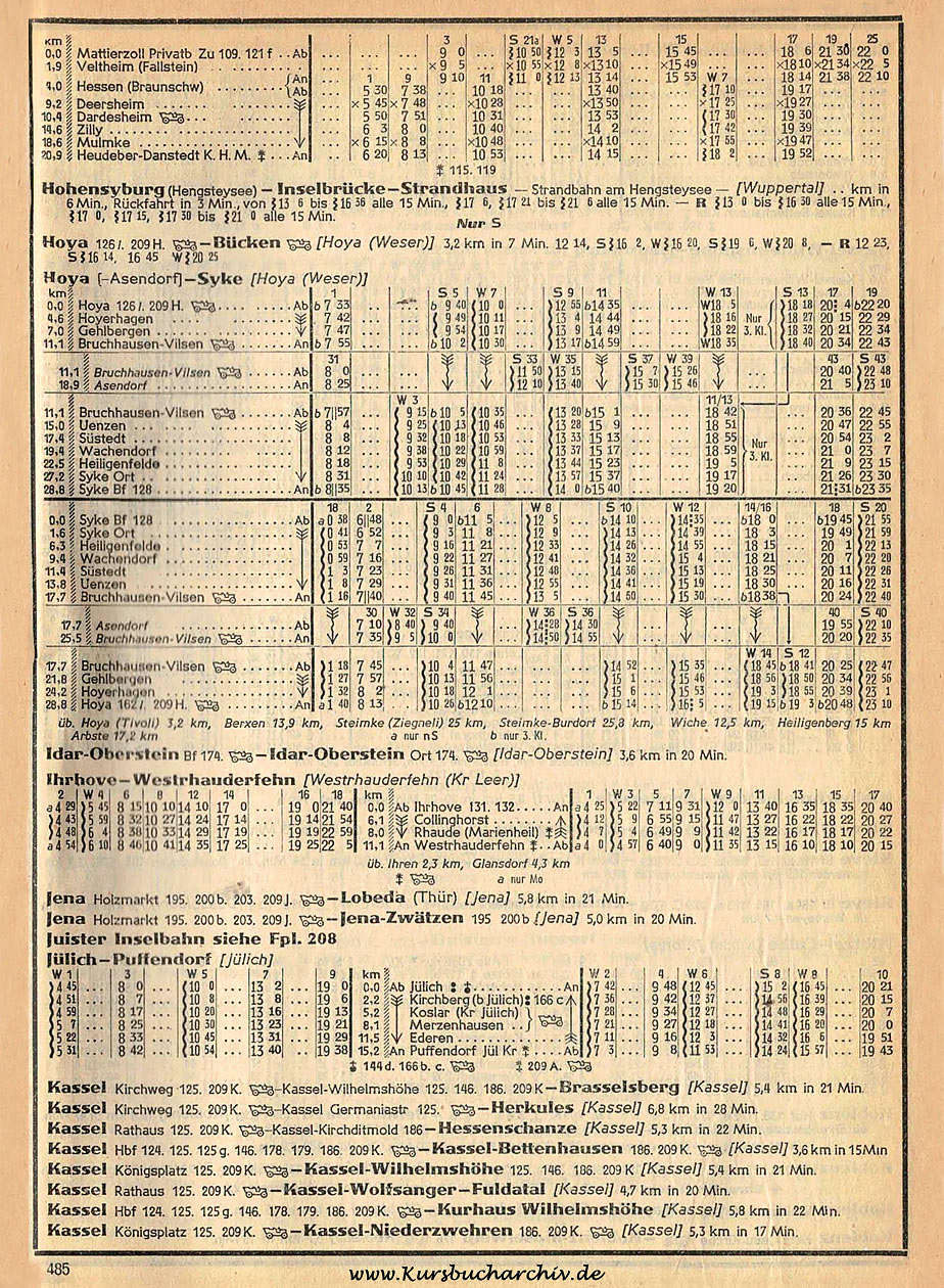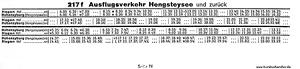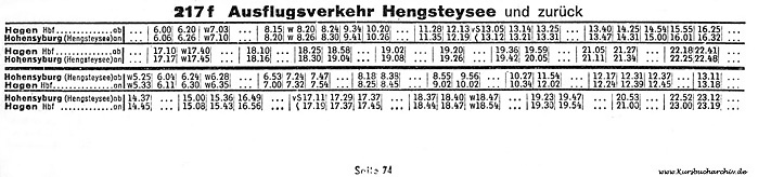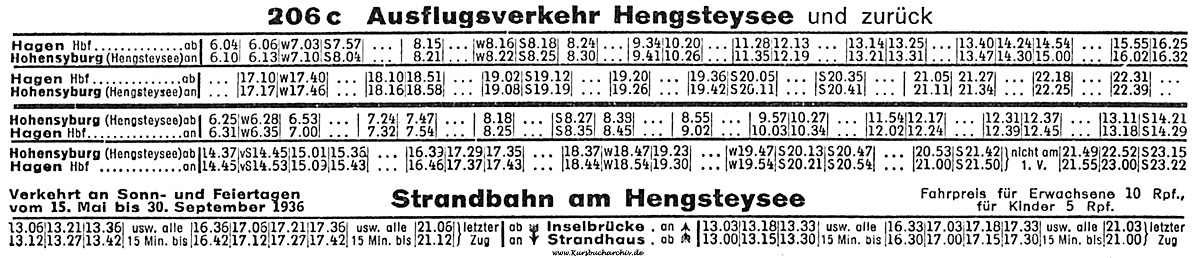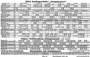 Gefahren wurde ja nur jeweils im Sommerfahrplan und das in der Zeit vom 15. Mai bis 30. September des Jahres an Sonn- und Feiertagen im Fünfzehnminutentakt in der Zeit von 13.00 Uhr bis 21.00 Uhr. Im Sommerkursbuch 1935 waren dazu noch umfangreich die Anschlusszüge aus Hagen, Schwerte und von der Ruhr-Siegstrecke bis Hohensyburg direkt einsehbar gelistet, wie dieser Auszug zeigt: