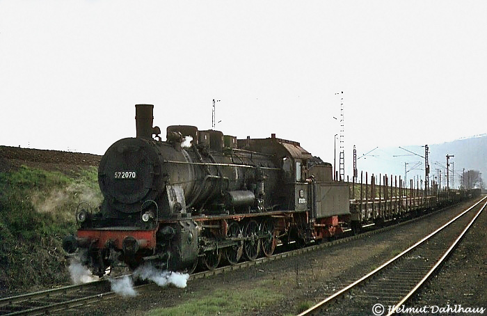 km 0,5 Ausziehgleise Ablaufberg Ost Rangierbahnhof HengsteyAm 06. April 1968 erwischte Helmut Dahlhaus die 57 2070 vom Bw Hagen Gbf im Abdrückdienst am Hengsteyer Ostberg. Das Gleis rechts neben der Lok wurde dabei zwischen 1930 und 1938 für die Züge der Strandbahn zum Strandhaus genutzt.