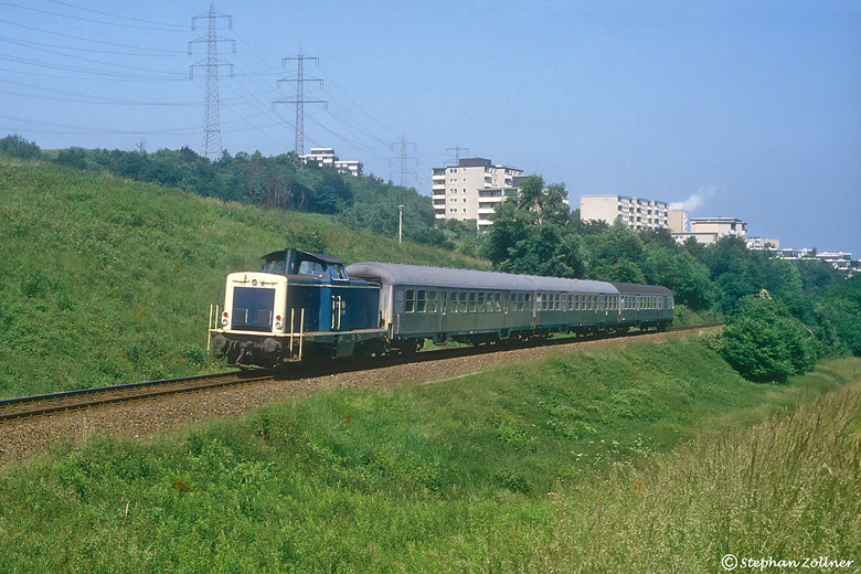 Im Jahr 1986 war der Blick vom Schapker Weg in Iserlohn auf die Trasse der Ardeybahn noch frei. Die Bebauung am Hombruch mit Wohnsilos hielt sich gegenüber heute noch in Grenzen, als N 6528 von Iserlohn nach Dortmund, von 212 307 geschoben auf den Haltepunkt Iserlohnerheide zurollt.