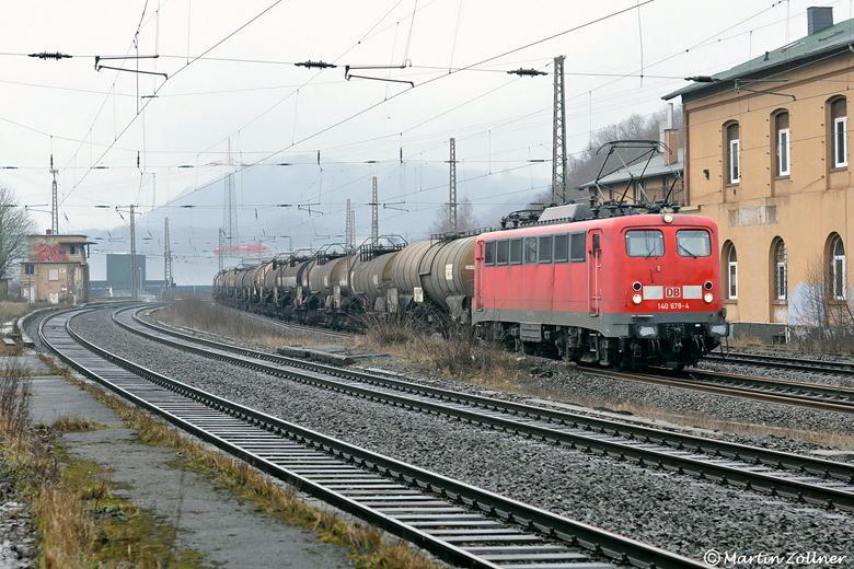 Als am trüben 27. Februar 2009 die 140 678 mit ihrem Kesselwagenzug den Bahnhof Westhofen ostwärts durchfuhr, war dieser bereits ziemlich heruntergekommen. Der Bahnsteig am Gleis 1 noch vorhanden, zwischen Gleis 2 und 3 schon Jahre entfernt. Die letzten Personenzüge hielten hier 1979. Auch das Stellwerk Wf (links) war bereits 6 Jahre außer Betrieb, die Weichen und Signale nun von Hagen Hbf aus ferngestellt.