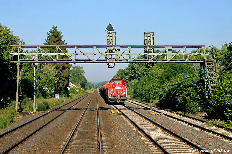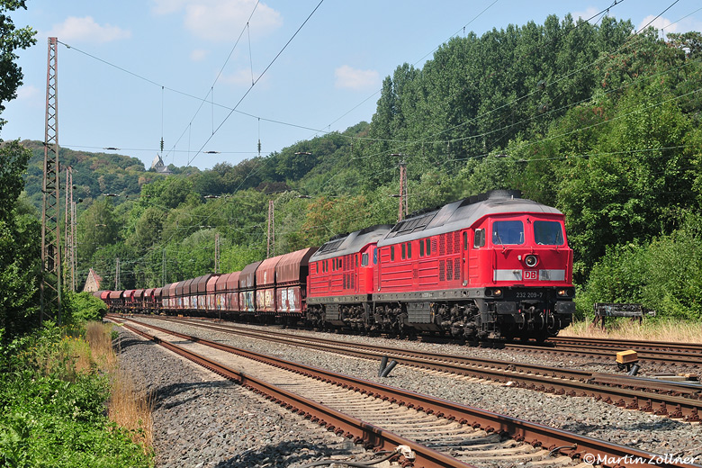 Wegen Bauarbeiten an Gleisen, Brücken und Lärmschutzanlagen wurden bei Vollsperrung der Strecken Abzw Stockumer Straße – Witten und Wengern Ost – Vorhalle vom 13.07. bis 06.08.2018 montags bis freitags diverse Güterzüge der Relation Vorhalle – Bochum-Langerdreer über Schwerte und Do-Hörde umgeleitet. Dazu wurden in Vorhalle auch vier Loks der Baureihe 232 vorgehalten. Am Mittag des 03. August konnte die Starleistung in der Einfahrt Westhofen bildlich festgehalten werden, als das Doppel aus Ludmilla 209 und 255 samt Mischzug dem Teilziel Bochum entgegenräuchert.
