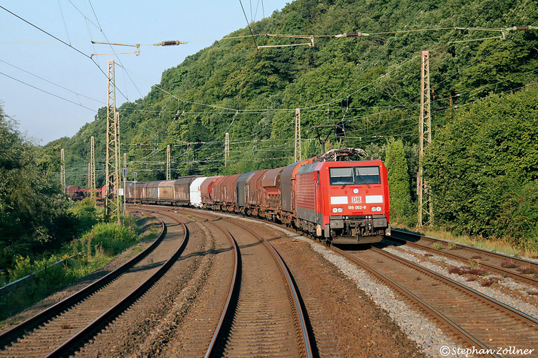 Km 150,0 Syburg BölsbergAm frühen Morgen des 21. August 2015 strahlt die mehrsystemfähige 189 002 bei Syburg Bölsberg mit der Sonne um die Wette. Mit einem gemischten Güterzug in Richtung Hamm unterwegs, wartet sie am Einfahrtsignal Westhofen die Kreuzung mit RE 10706 ab, ehe schon hier im Westen von der Strecke 2843 auf die 2550 gewechselt wird.