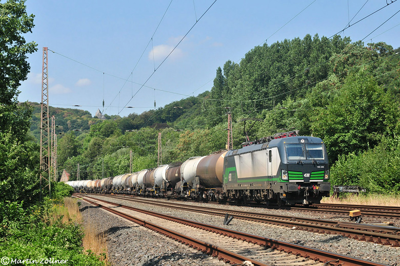 Ständig wechselnde Laufwege zeichnen den Kreidschlammzug von Jesenice nach Schwerte ⁄ Ruhr aus. Lediglich auf den letzten Metern vom Abzweig Hohensyburg bis zum Zielbahnhof kommt er immer vorbei, wie am schönen 08. August 2018, als SETG-Mietlok 193 285 die Traktion inne hatte. Aufnahme an der Westhofener Einfahrt.