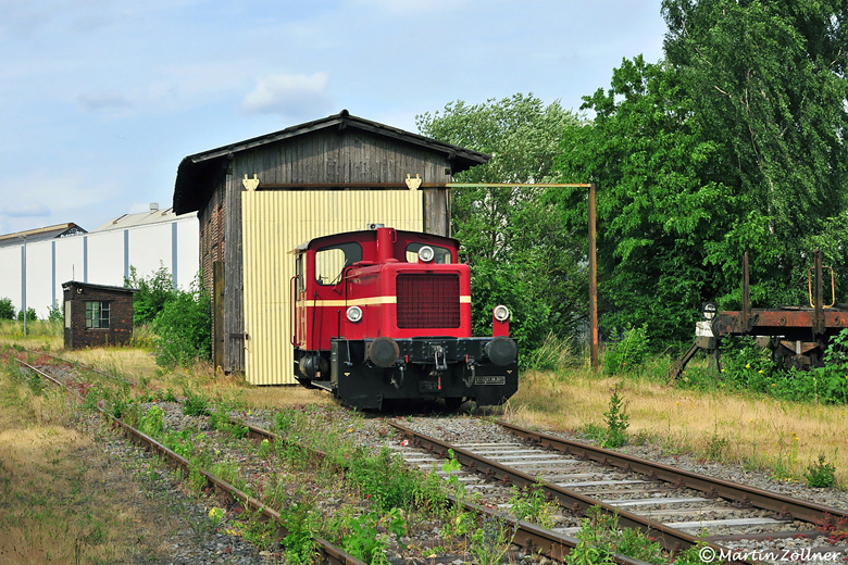 Von der Leihlok 332 901 bei der Fa. Schwerter Profile GmbH wurde am Abend des 23. Juni 2023 noch eine weitere Portraitaufnahme vor dem idyllisch gelegenen, alten Lokschuppen angefertigt. Das Bild könnte auch gut 35 Jahre früher in der sogenannten Epoche Vier entstanden sein.