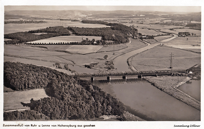 Km 149,343 Abzweig Hohensyburg [EHOY]Die Linie 2843 beginnt in Streckenkilometer 149,343 genau vor dem Stellwerksgebäude der Abzweigstelle Hohensyburg und quert dann sogleich den Zusammenfluss von Ruhr und Lenne auf einer sechsteiligen Fachwerkträgerbrücke. Auf dieser Postkarte von ca. 1930 ist das Gebäude ganz rechts mittig im Bild gut auszumachen.