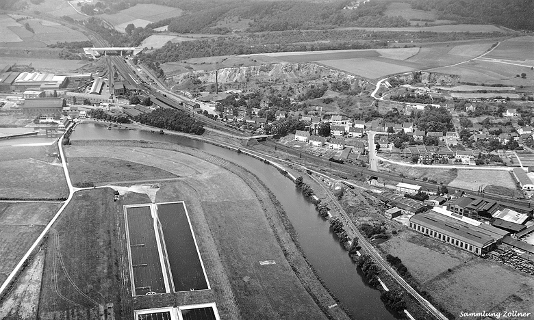 Eine Luftaufnahme vom Bahnhof Westhofen aus dem Jahr 1958 können wir hier zeigen. Gut zu erkennen die Kurvenlage sowie die im Hintergrund gerade im Bau befindliche Brücke der Autobahn A1.