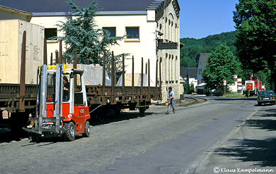 In Streckenkilometer 0,550 befand sich die Firma Steinberg. Die Laufkatze des Portalkrans reichte –wenn er bis zum Schienenende gefahren wurde– bis ins Profil des Streckengleises. So wurden dort auch für den Stahlhandel bestimmte Wagen entladen, wie am 28. Juli 1986, als Klaus Kampelmann diese Aufnahme mit 290 079 anfertigte.