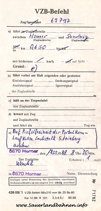 Bis dorthin konnte als Rangierfahrt gefahren werden, wie an der in Bildmitte erkennbaren Rangierhalttafel zu sehen. Zugfahrten nach Sundwig erhielten wegen der nicht garantierten Profilfreiheit für diesen Bereich einen VZB-Befehl zum Fahren auf Sicht, wie der Scan rechts vom 18. März 1988 zeigt. Der Betrieb wurde einige Jahre später ohne Gleisanschluß zur Oese umgesiedelt.
