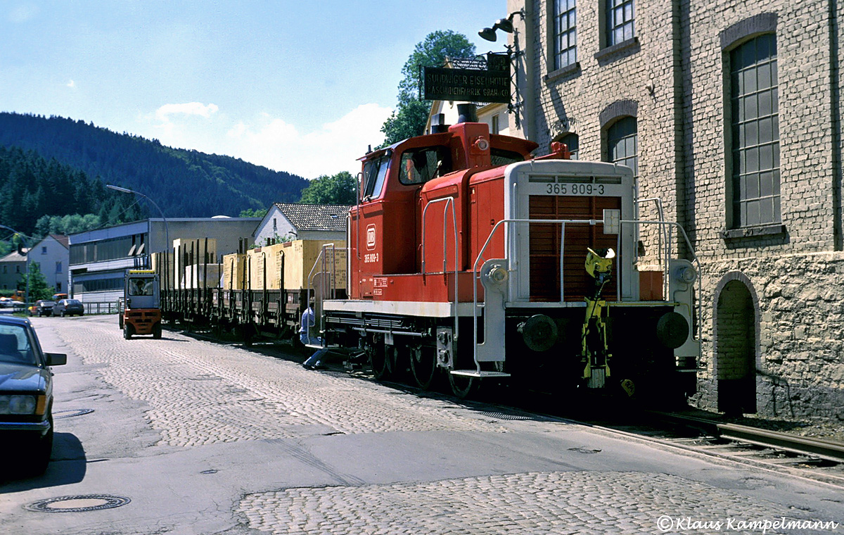 Km 2,218 Sundwig Gla Eisenhütte, StreckenendeUm das lästige Umfahren im Bahnhof Sundwig zu sparen, wurden die Abgangswagen der Eisenhütte meistens mit dem O & K - Firmengabelstapler ins Streckengleis bis vor den Prellbock gezogen. Dann konnte die Lok über die Anschlussweiche vorsetzen und gleich von hier aus nach Hemer durchstarten, wie auf diesen Bildern von Klaus Kampelmann vom 16. Juni 1989 mit 365 809 zu sehen.
