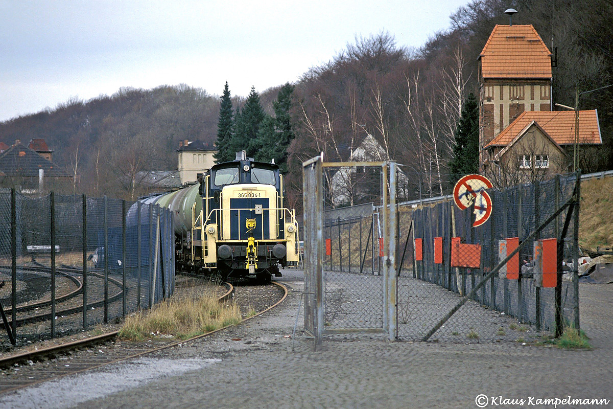 Sehr selten wurde das Treibstofflager für die Panzerbataillone der Hemeraner Blücherkaserne in Sundwig mit Kesselwagen beliefert. Klaus Kampelmann hatte am 31. Januar 1990 Glück, als er 365 834 in dem umzäunten Gelände durch das geöffnete Tor aufnehmen konnte.