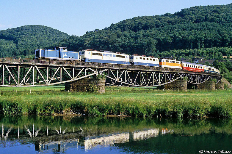 Am 29. Juni 1986 fand in Plettenberg-Oberstadt ein Bahnhofsfest statt. Bei der abendlichen Rückführung der Ausstellungsfahrzeuge hatte das Fußballweltmeisterschaftsendspiel Argentinien – Deutschland der WM in Mexiko aber bereits fast alle Eisenbahnfotografen an den heimischen Fernsehapparat gezogen. Bei den beiden Zöllners lag die Priorität aber auf 212 320 mit ihrem illustren Anhang, hier auf der Lennebrücke bei Plettenberg-Ohle bildlich verewigt.