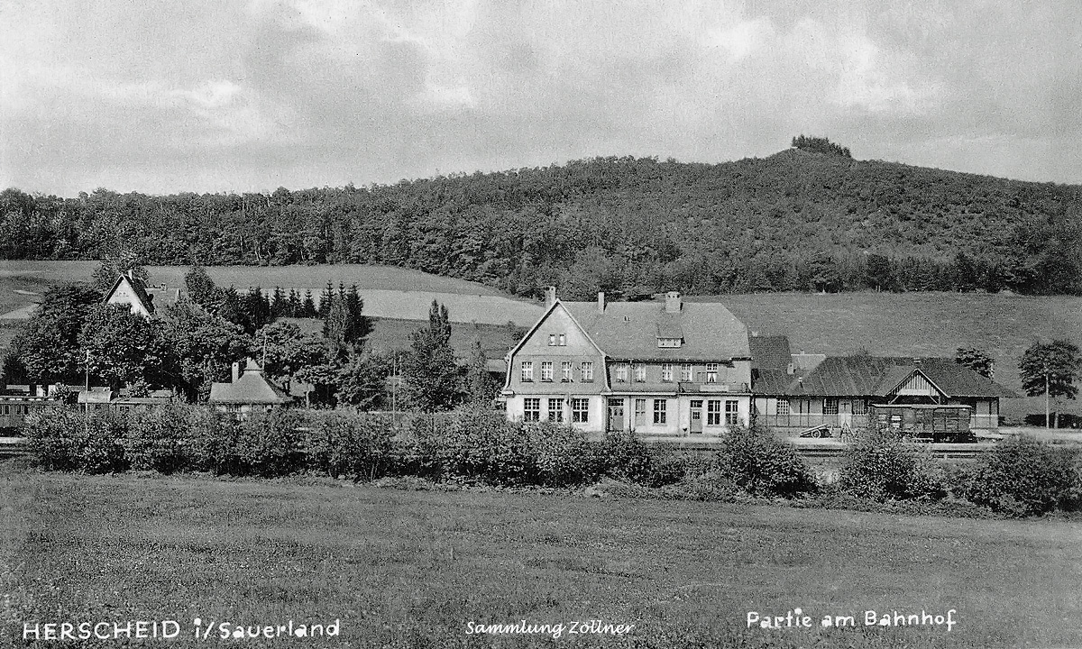 Km 16,22 Bahnhof Herscheid [.HER]Das Bahnhofsgebäude von Herscheid zeigt diese Postkartenaufnahme nach dem Krieg im Jahr 1946. Am Güterschuppen steht der obligatorische Stückgutwagen. Der der Anlagen Abriß erfolgte am 17.09.2025.